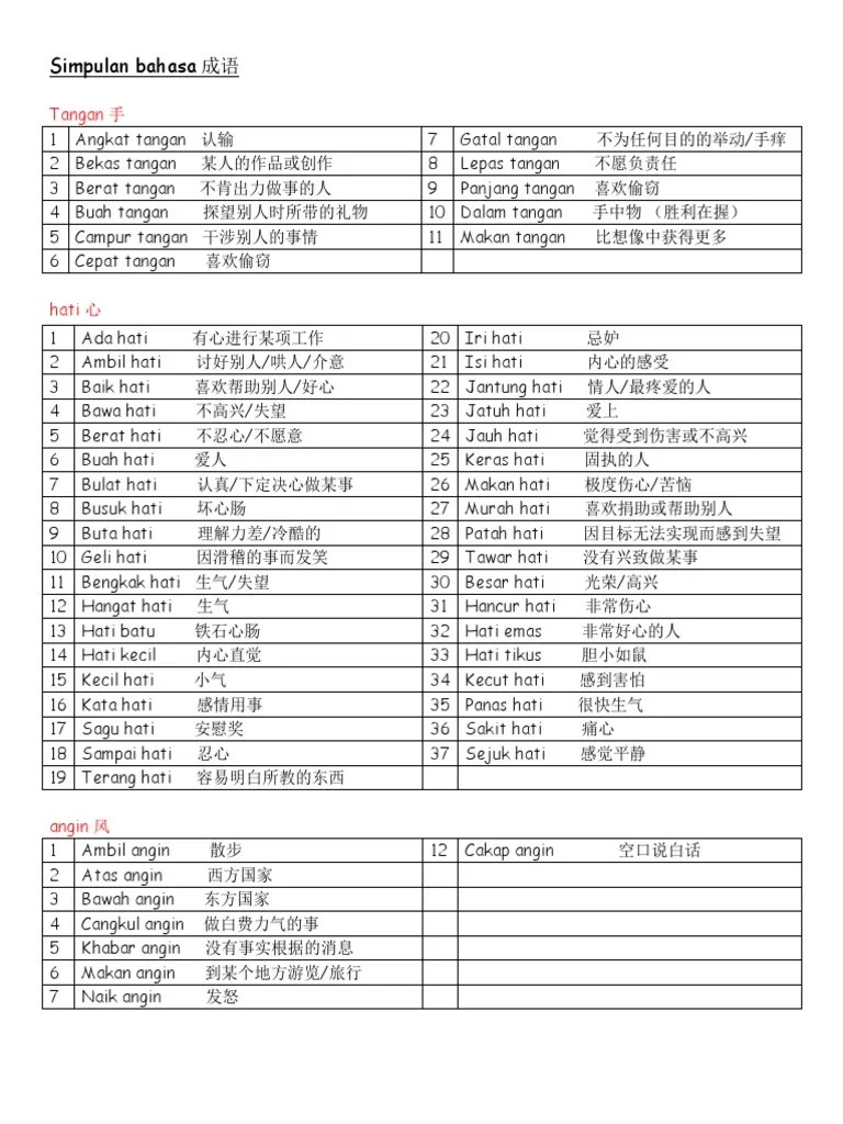 Senarai simpulan bahasa beserta dengan maksudnya adalah seperti yang berikut: